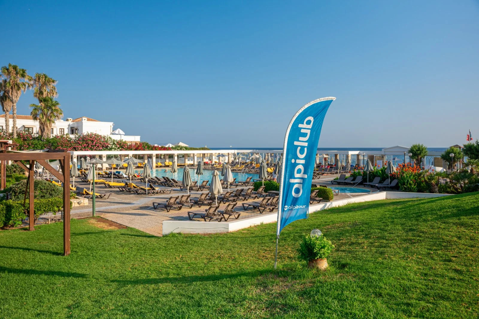 Si affaccia direttamente sulla spiaggia di sabbia e ciottoli, con accesso al mare roccioso in alcuni tratti, e inoltre, con una passeggiata di circa 500 metri, si possono facilmente raggiungere numerose calette di sabbia chiara e fine, dal mare cristallino. Dispone di 4 piscine di cui 2 per bambini, una delle quali presso il miniclub. Uso gratuito di lettini e ombrelloni sia in piscina sia in spiaggia fino a esaurimento, disponibili teli mare.