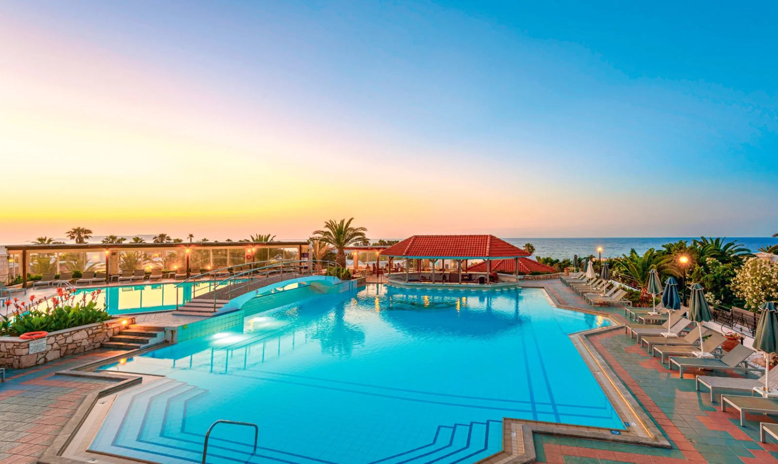 Situato in località Anissaras, a circa 2,5 km da Hersonissos luogo ideale per aperitivi e passeggiate serali dal sapore greco. Dista 25 km dall’aeroporto e dalla città di Heraklion. L’aeroporto di Chania si trova a circa 169 km. Fermata bus di linea di fronte all’hotel. Costituito da vari edifici in stile bungalow a due piani e da un corpo centrale che ospita i servizi comuni, piacevolmente inseriti in colorati giardini.