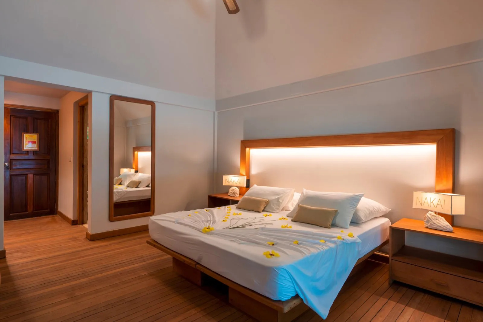 173 tra bungalow e camere recentemente rinnovati. I beach bungalow sono disposti lungo il perimetro dell’isola, tutti fronte mare, immersi nel verde, a pochi passi dalla spiaggia, dotati di patio in legno arredato e con tetti ricoperti di Kadjan, si suddividono in: 64 beach bungalow vista mare (massima occupazione 4 adulti), 26 sunset beach bungalow vista tramonto (massima occupazione 4 adulti), 6 family beach bungalow (massima occupazione 6 adulti) dotati di un grande soppalco che ospita due letti e si estende su tutta la lunghezza della camera. Tra i beach bungalow sono disponibili 2 coppie di bungalow comunicanti (massima occupazione 7 adulti). 29 garden bungalow posizionati all’interno dell’isola, con affaccio su piccole aree verdi loro riservate e dotati di patio in legno (massima occupazione 3 adulti). Gli over water bungalow sono 34, tutti realizzati su palafitte, con le loro terrazze in legno recentemente rinnovate, ingrandite e dotate di amache sospese sul mare (massima occupazione 3 adulti, età minima 12 anni). Inoltre 12 camere standard garden (massima occupazione 3 adulti), situate in una costruzione a 2 piani in prossimità del ristorante, realizzate nel 2021 e caratterizzate da un arredamento con mobili artigianali in legno pregiato che offrono un design nuovo, abbinando lo stile maldiviano a quello moderno, con ampia terrazza in legno al piano superiore o piccolo giardino privato al piano terra. Tutte le camere dispongono di servizi privati, doccia, asciugacapelli, aria condizionata, ventilatore a soffitto, cassetta di sicurezza e frigobar (consumazioni a pagamento). I beach bungalow, i garden bungalow e le standard garden hanno in dotazione due lettini da posizionare sulla spiaggia loro antistante; gli over water bungalow hanno a disposizione due lettini e tavolino in legno posizionati sulla terrazza. Agli ospiti in over water bungalow, il resort offre l’accesso Wi-Fi gratuito (un dispositivo per camera).