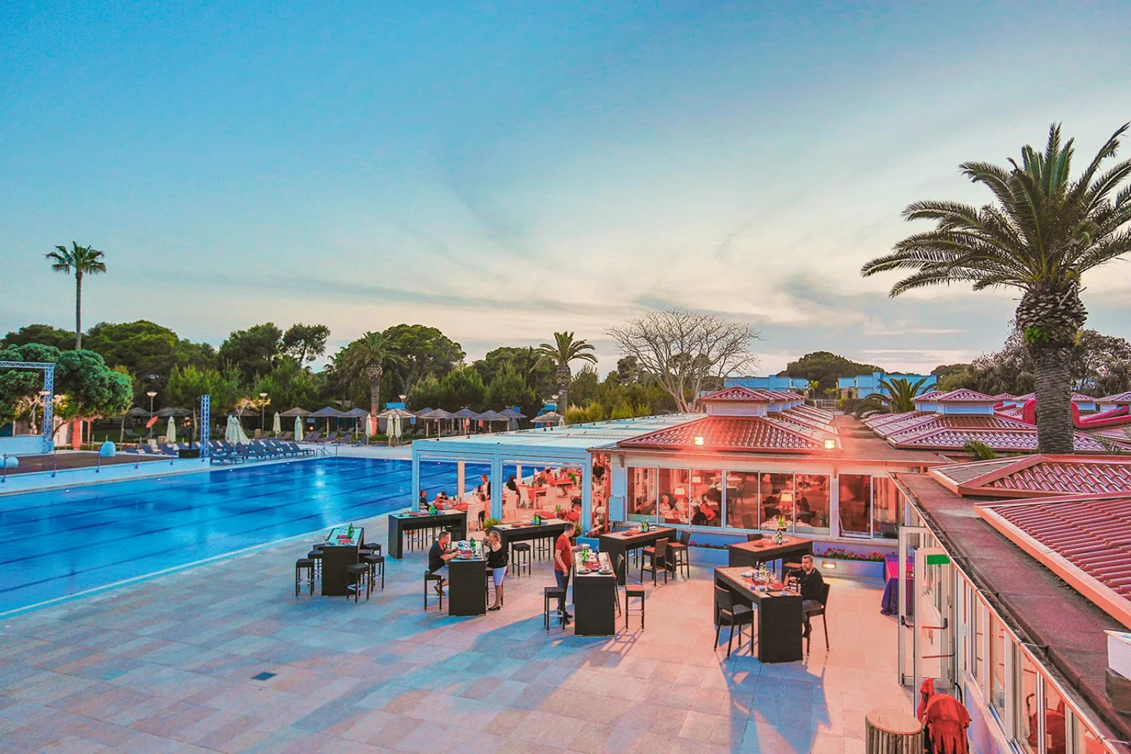 8 campi da tennis con superficie di sabbia al quarzo, di cui 4 con illuminazione, calcetto, tiro con l'arco, aquagym, pallacanestro, ping-pong, bocce, beach volley e vela (patentino necessario), discoteca, piano-bar in pineta (aperto in alcuni orari), programma ricco e coinvolgente con animazione internazionale. A pagamento: 2 campi da padel illuminati, corsi sportivi di wind surf, catamarano, tennis, massaggi, parrucchiere, estetista, escursioni.