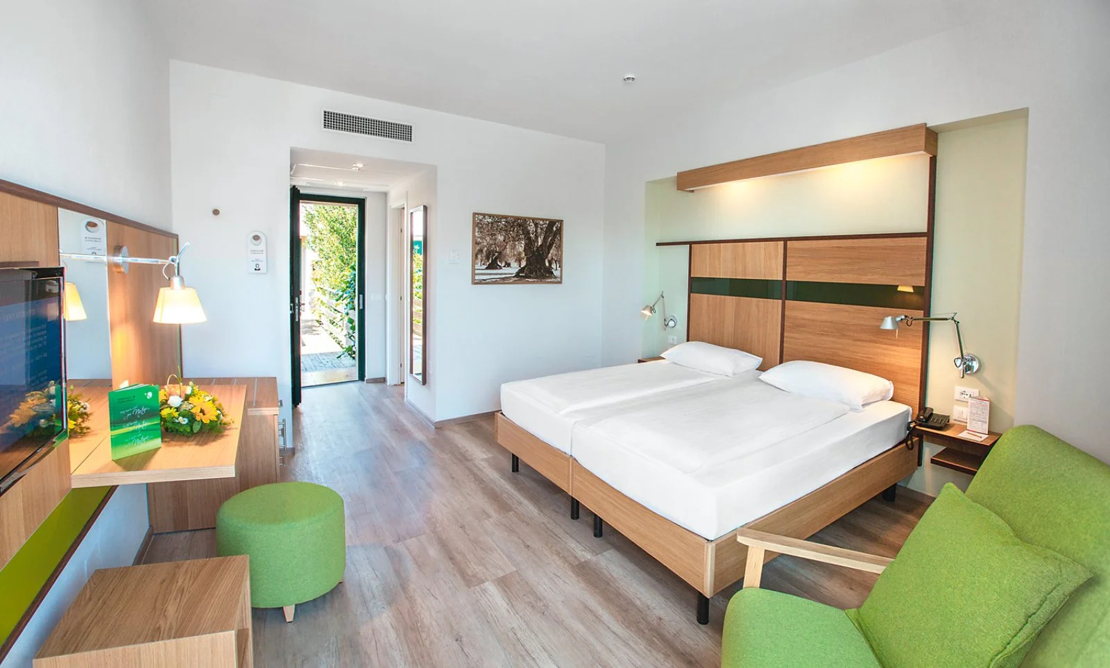 Camera (circa 33 mq), con occupazione minima di 1 adulto e massimo 4 adulti oppure 2 adulti e 2 bambini 2-17 anni e 1 infant sotto i 2 anni, dotata di letto matrimoniale, divano letto e letto aggiuntivo, servizi privati, asciugacapelli, aria condizionata regolabile autonomamente, Wi-Fi, cassetta di sicurezza, TV satellitare, minifrigo, balcone o terrazzo attrezzato.