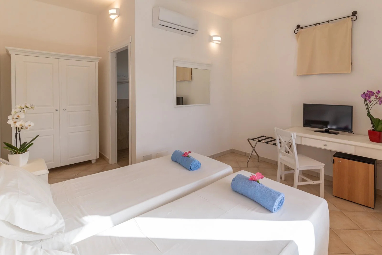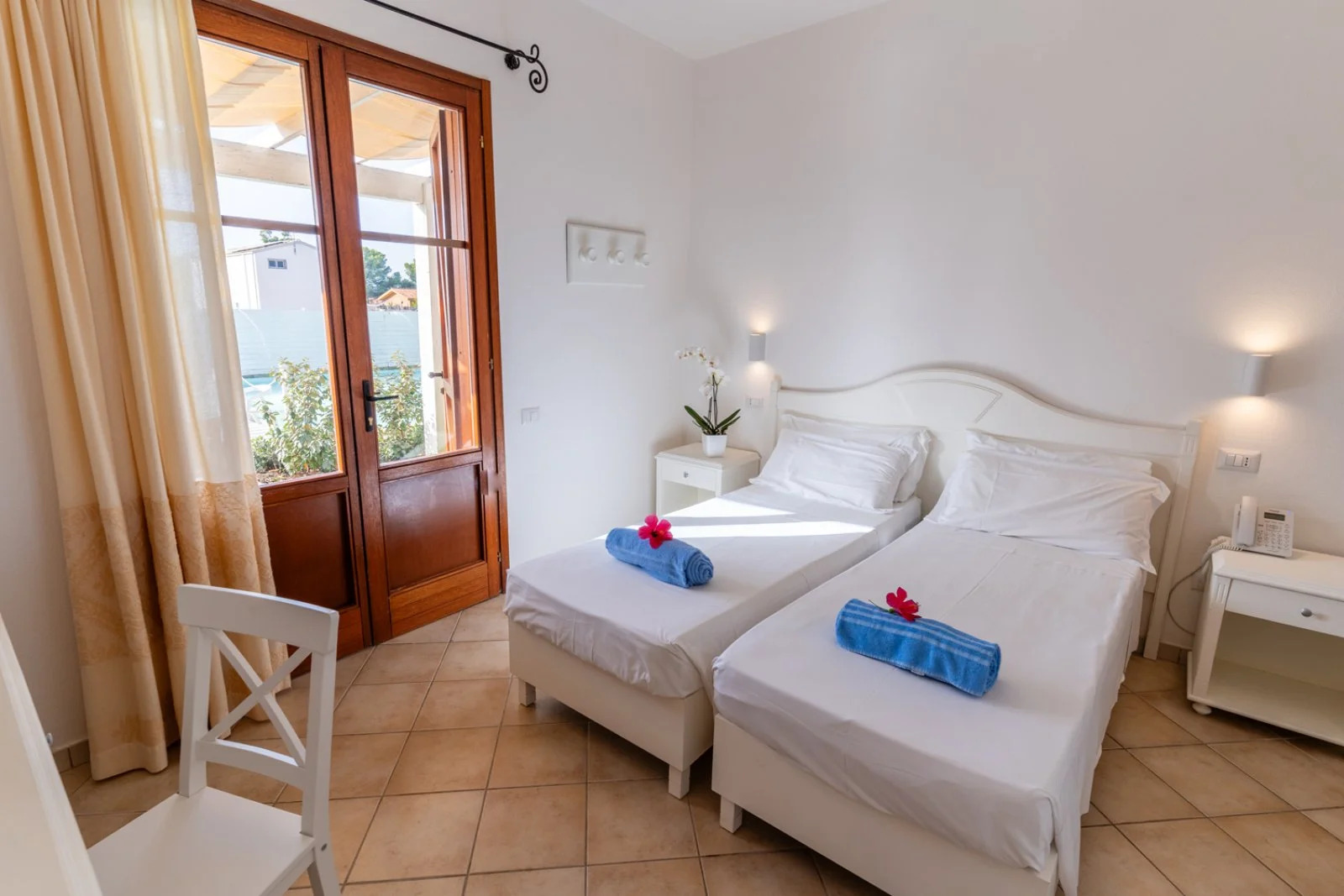 Il villaggio è costituito da 135 camere, tutte situate al piano terra, suddivise tra classic, comfort, family e deluxe. Tutte le camere dispongono di due letti singoli, all’occorrenza unibili in un matrimoniale (eccetto le deluxe dotate di letto matrimoniale non separabile), servizi con doccia e asciugacapelli (su richiesta e dietro cauzione nell’area deluxe), TV a schermo piatto, aria condizionata, cassetta di sicurezza, minibar con consumazioni a pagamento. La maggior parte delle camere sono dotate di patio attrezzato. Le camere comfort sono rinnovate negli arredi e nei bagni. Le camere family sono composte da due camere comunicanti, alcune di esse possono ospitare fino a 5 persone. Le camere deluxe, di recente costruzione, con un arredo più moderno e luminoso, dotate di TV a schermo piatto, inoltre dispongono di ampia doccia walk-in, con letto aggiunto di cm 180 in poltrona letto.