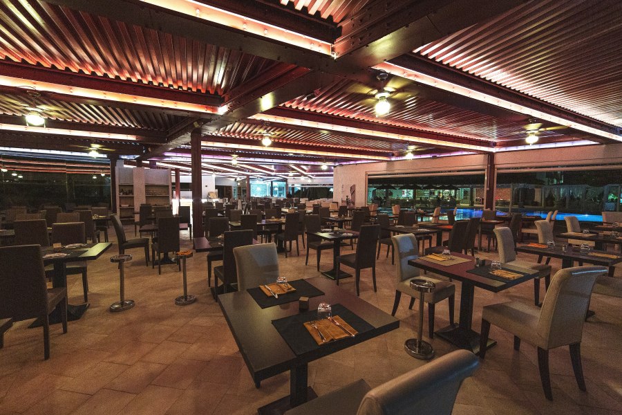 Ristorante con vetrate aperte direttamente sulla zona piscina e una parte della sala dotata di aria condizionata., bar, chiosco in spiaggia.