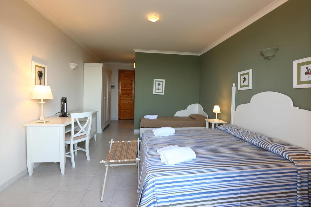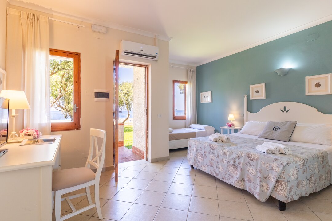 La struttura dispone di 288 camere di varie tipologie, alcune con vista mare (con supplemento): doppie, triple, quadruple con letti piani e/o a castello e camere quintuple dagli ambienti particolarmente ampi, per 5 persone, con letti a castello. Arredate con stile semplice e raffinato, si trovano nel corpo centrale del villaggio e lungo i piccoli viali immersi nel verde della macchia mediterranea. Tutte dotate di servizi privati con doccia e asciugacapelli, aria condizionata, TV, cassetta di sicurezza, telefono e frigobar (con riempimento su richiesta e a pagamento).
