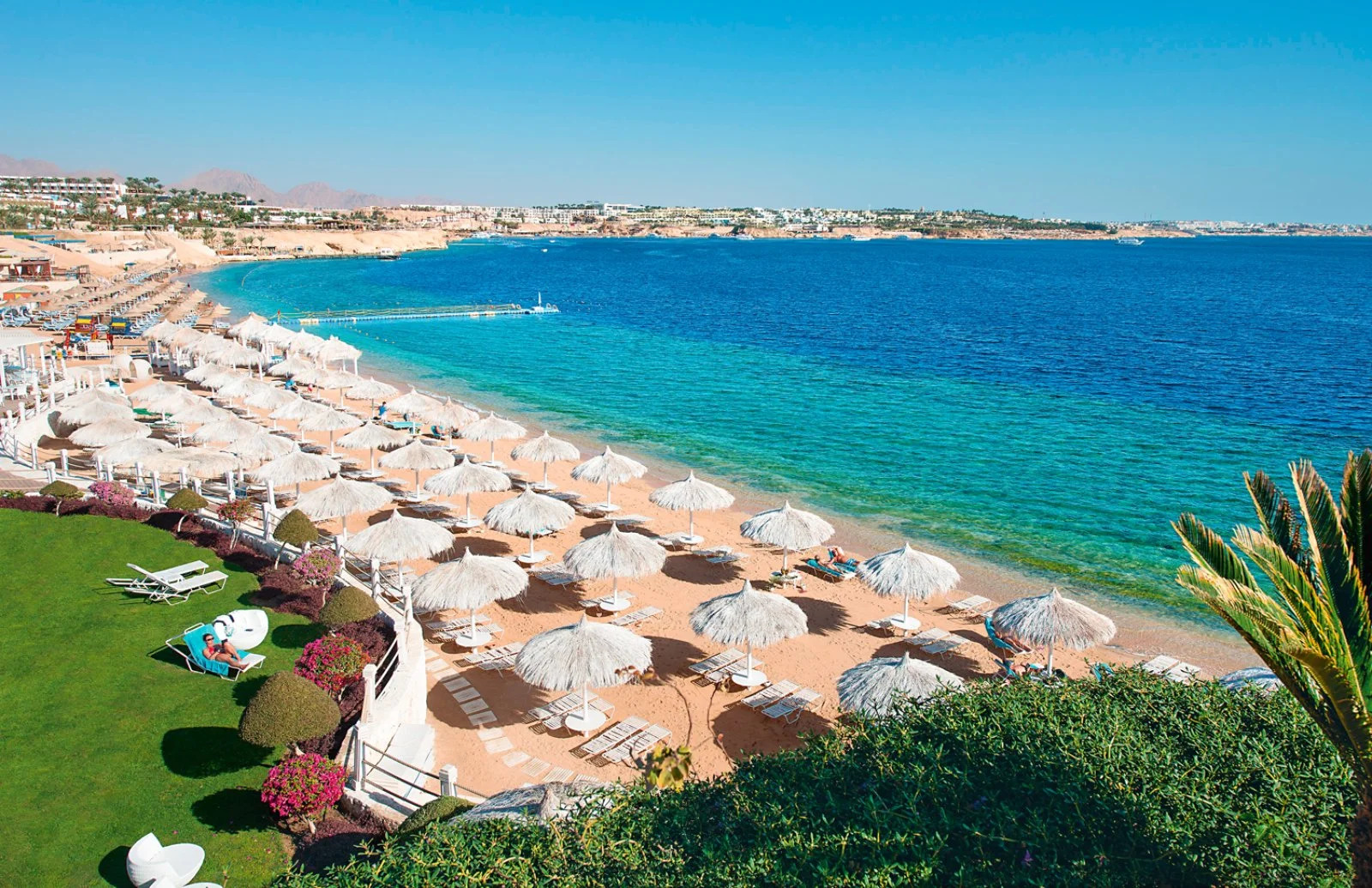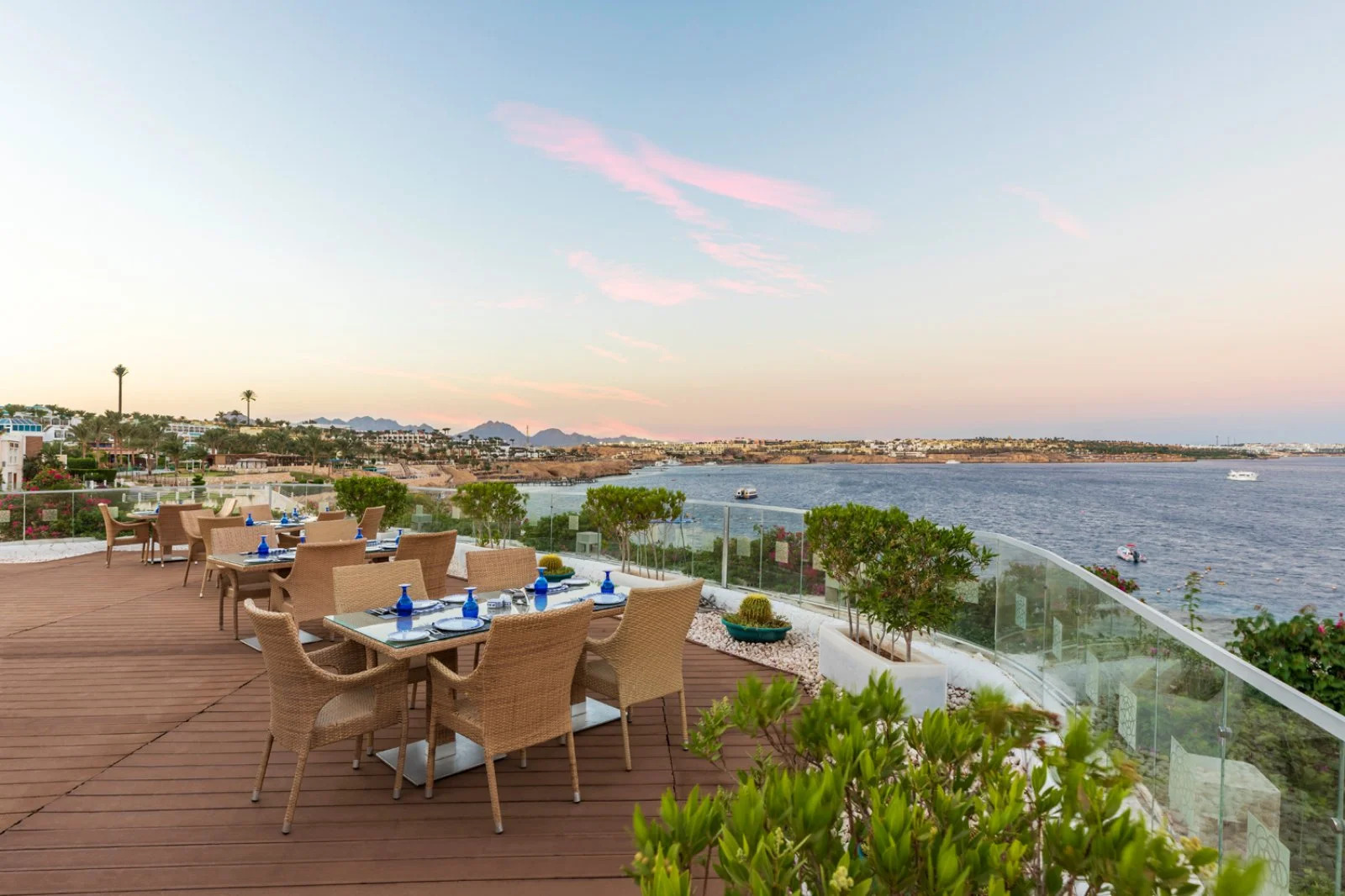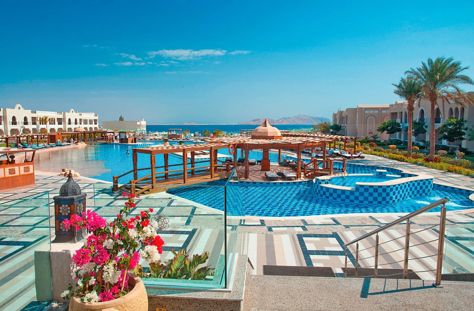In posizione panoramica a Shark's Bay, circa 8 km dall'aeroporto e 11 km da Naama Bay. La struttura si sviluppa su 6 livelli digradanti verso il mare; le camere si distribuiscono ai lati delle piscine. Spiaggia di sabbia, che si affaccia su un tratto di barriera corallina molto ricca. Accesso al mare tramite pontile. 5 piscine, di cui una per bambini, tutte riscaldate in inverno. Utilizzo gratuito di ombrelloni, lettini e teli mare in piscina e in spiaggia.