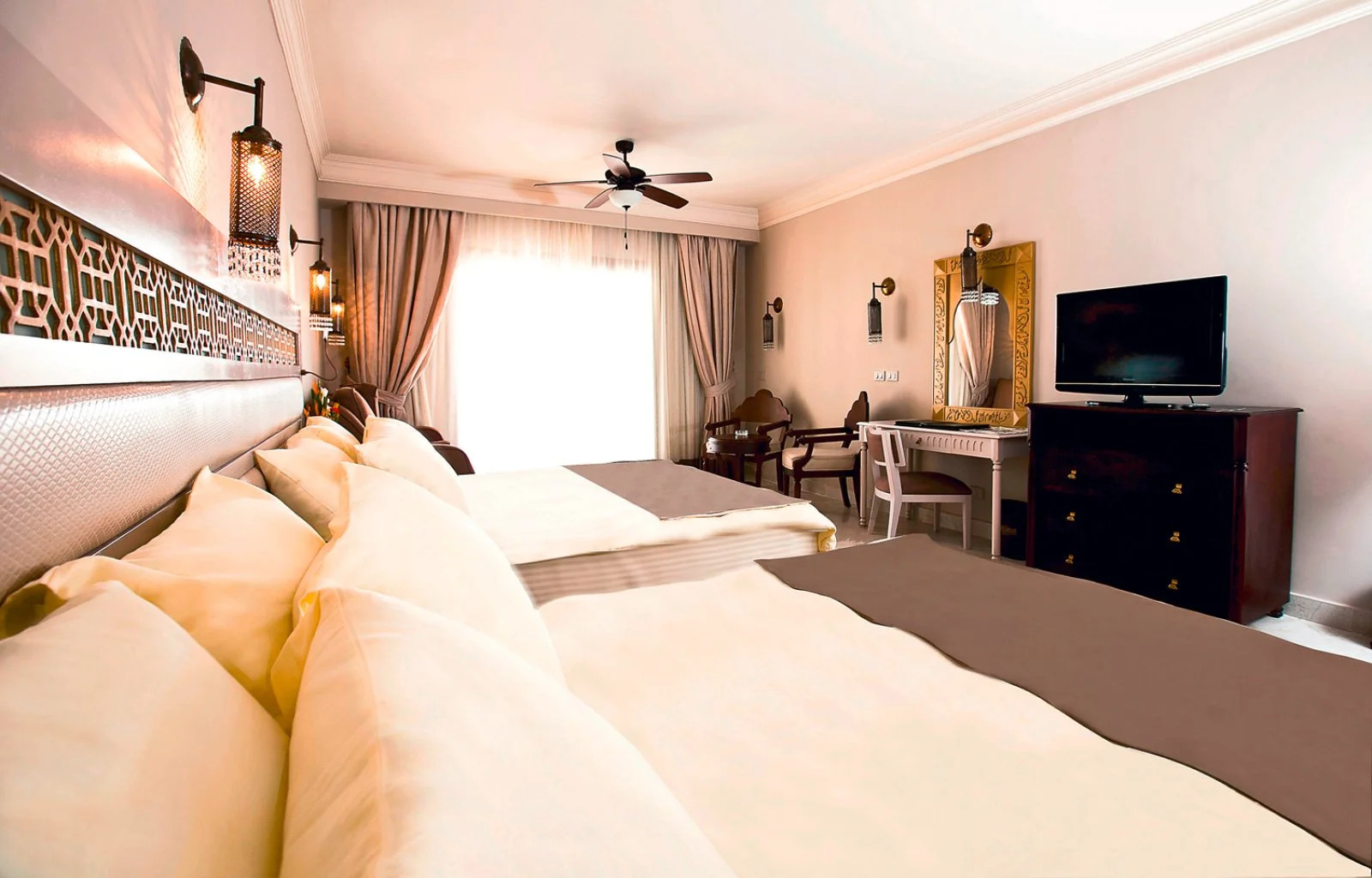 421, tutte con asciugacapelli, climatizzazione, TV LCD, telefono, Wi-Fi, cassetta di sicurezza, set per la preparazione di tè e caffè, accappatoio e ciabattine, balcone o terrazzo. Sono disponibili doppie superior vista giardino o vista piscina e mare laterale (massimo 3 adulti o 2 adulti + 1 bambino), doppie deluxe vista piscina e vista mare laterale (massimo 2 adulti + 1 bambini o 3 adulti), doppie deluxe swim up (minimo 16 anni, massimo 3 adulti), con piccolo salotto e accesso diretto alla piscina riservata, family suite composte da 2 ambienti separati da una porta e un bagno (massimo 3 adulti e un bambino). A pagamento: consumazioni minibar.